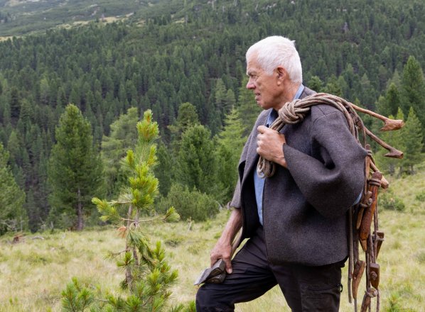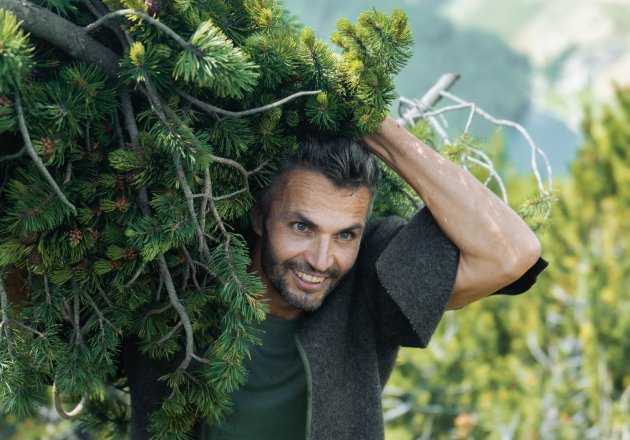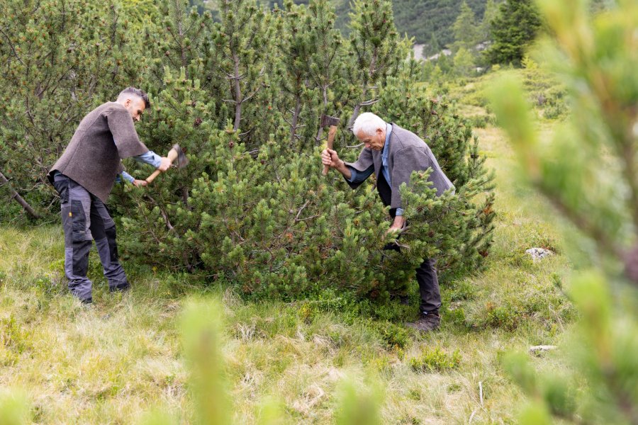 Wenn der Schnee im Frühjahr die Latschen freigibt, machen sich die Männer an die Arbeit. Die Latschen werden „gehackt“, d.h. die mit Nadeln besetzten Zweige werden gekonnt mit scharfer Axt abgetrennt.