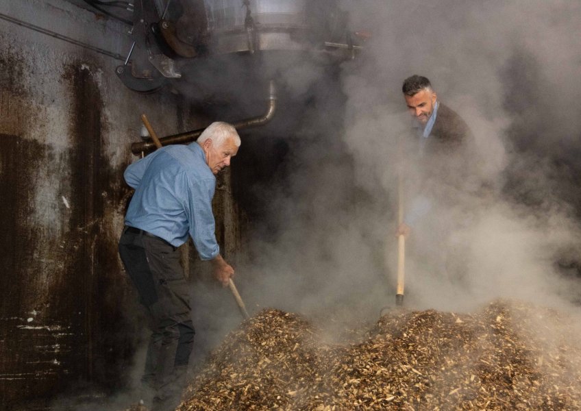 Der Kessel wird indirekt beheizt und der Destillationsvorgang kann beginnen. Das Destillationsverfahren erfolgt auf dem Wasserdampfprinzip. Nach etwa 6 Stunden Brennzeit ist den Zweigen das kostbare Öl entzogen. Der Kessel wird entleert und ein neuer Brennvorgang kann beginnen. Das Abfallprodukt wird zur Beheizung des Kessels wiederverwendet. Das Öl ist leichter als Wasser und bleibt deshalb an der Oberfläche. Somit kann es leicht von dem wieder in den flüssigen Aggregatzustand zurückgekehrten Wasserdampf abgesondert werden.